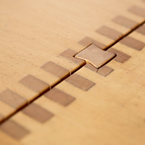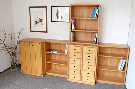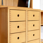 aus Buche massiv, variabel austauschbar durch Schwalbenschwanz-Steckverbindung, Ecken mit Fingerzinken, Innenschübe mit Vollauszügen aus Holz, Türen mit Gratleisten.